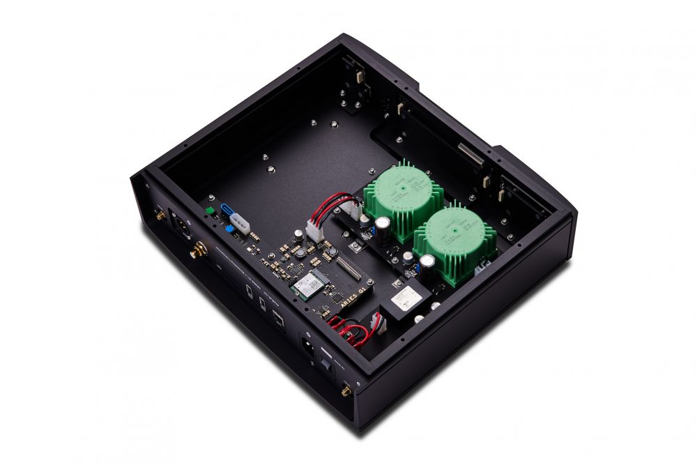 L'Aries G1.1 est équipé de sorties USB, coaxiale, optique et AES/EBU. Ses connectivités sans fil incluent le WiFi tri-bande, l'AirPlay 2 et le Bluetooth. Un capteur IR intelligent permet l'utilisation de toutes les télécommandes du marché. Sa plateforme matérielle Tesla lui offre un processeur quadruple-cœur, une mémoire vive de 2 Go et d'une mémoire cache de 1 Go. Cette puissance lui permet de lire les fichiers PCM jusqu'à 32 bits / 384 kHz et DSD jusqu’au DSD256 en natif ou en DoP, mais également de proposer l'upsampling en temps réel de tous fichiers PCM, quel que soit leur format d'origine, jusqu'à 32 bits / 384 kHz. Sa mémoire cache permet, quant à elle, de réduire le jitter pour obtenir une musique encore plus pure. Il est équipé d'une double horloge Femto et d'une double alimentation linéaire Purer-Power à faible bruit. Cette dernière a été étudiée pour séparer et isoler les circuits processeur des circuits audio afin de minimiser les interférences et optimiser la qualité du signal de sortie. Pour parfaire le tableau, le châssis est entièrement réalisé en aluminium massif épais afin d'isoler les composants des interférences extérieures. Il dispose d’un emplacement interne pour accueillir un disque SSD, permettant de stocker la musique en interne pour une facilité d’utilisation et des performances optimales. Pour ce faire, un kit de montage SSD est vendu séparément. L'Aries G1.1 peut également extraire vos CD et les sauvegarder en haute qualité sur votre support de stockage, en connectant un lecteur CD sur son entrée USB. La gamme G1.1 inclue également l'Altair G1.1 : un streamer qui intègre un DAC et un préamplificateur.