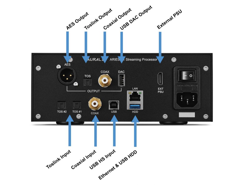 Au niveau de la connectique, l'Aries S1 propose une sortie USB, une sortie coaxiale, une sortie optique et une sortie AES/EBU. Des entrées numériques sont également disponibles, permettant de connecter des sources numériques (téléviseur, drive CD, ordinateur, ...) et de leurs faire bénéficier de traitement du signal numérique de l'Aries S1. Il est également compatible AirPlay 2 via le réseau. Concernant le stockage, il est possible de connecter un disque externe en USB. L'Aries S1 peut extraire vos CD et les sauvegarder en haute qualité sur un disque USB ou un NAS, en connectant un lecteur CD sur son entrée USB. Une prise HDMI est disponible mais ne vous y méprenez pas, il s'agit de l'entrée pour l'alimentation externe S1 PSU.