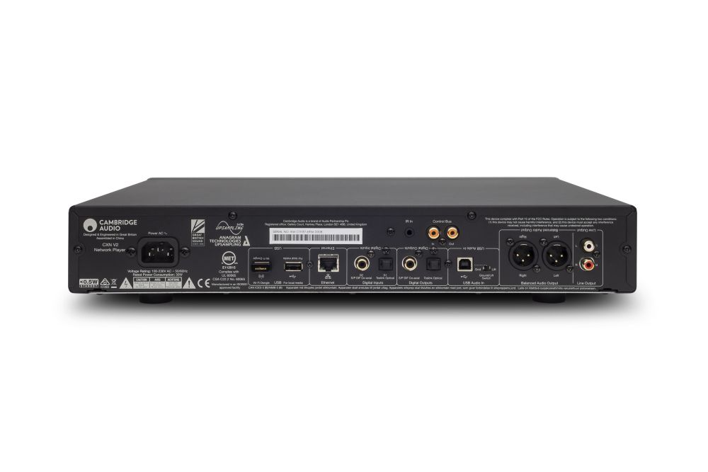 Le lecteur réseau Cambridge CXN V2 bénéficie d'une conception audiophile, il est compatible avec les protocoles réseau AirPlay et DLNA (smartphonesCambridge Audio CXN V2, NAS, ordinateurs), les fichiers au format 24 bits / 192 kHz ou DSD. Équipé de deux convertisseurs numérique-analogique 24 bits et 192 kHz, il peut être utilisé comme DAC audio USB avec tout ordinateur et bénéficie d'une connectique haut de gamme.