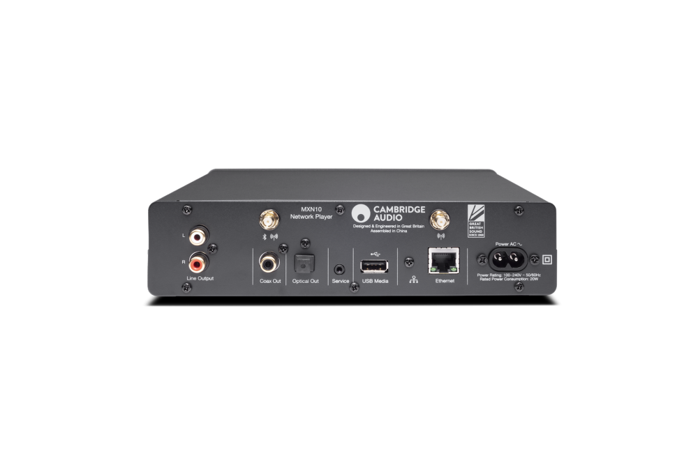 Tournez le MXN10 pour voir une paire de sorties phono RCA analogiques, une sortie numérique coaxiale et optique, une entrée USB, une paire de prises d'antenne wi-fi pour la connexion à un réseau sans fil - ou une entrée de câble LAN si vous préférez.