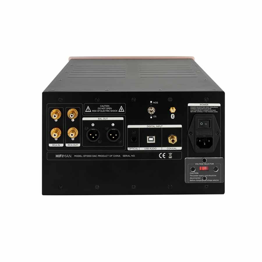 Der EF1000DAC verfügt über vier Eingangsoptionen: USB, optisch, koaxial und Cinch. Zudem ist der EF1000DAC mit Bluetooth ausgestattet und unterstützt die Codecs AAC, aptX, aptX HD, LDAC und SBC. An der Vorderseite des EF1000DAC befindet sich eine 4-polige XLR sowie eine 6.3 mm Kopfhörerbuchse. An der Rückseite sind Cinch und XLR Ausgänge vorhanden.