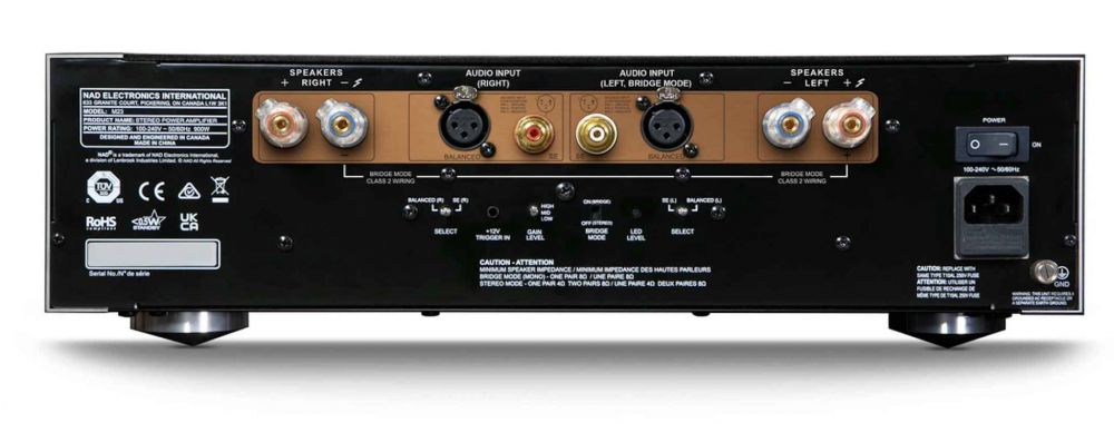 Besitzern eines NAD M33 Streaming-Vollverstärkers bietet sich zudem die Möglichkeit, ihre HiFi-Anlage zu einem System mit 2 x 700 Watt Dauerleistung auszubauen. Hier übernimmt dann der gebrückte M33 die Verstärkung des einen und die in Brückenschaltung laufende M23 die des anderen Stereo-Kanals.