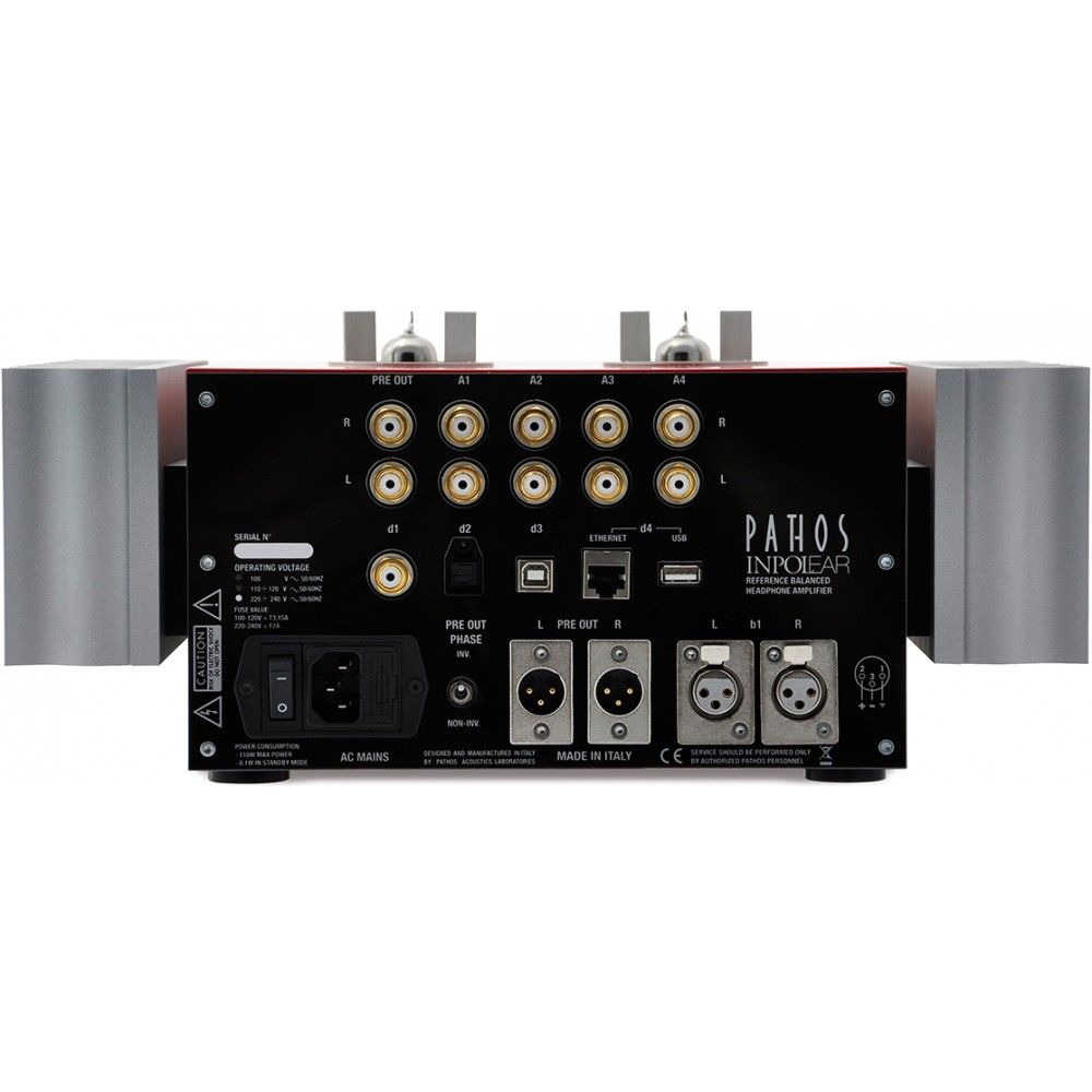 Von dem bildschönen Gehäuse des neuen InpolEar sollten sich Klangfetischisten jedoch nicht täuschen lassen. Denn im Inneren des Gehäuses sitzt die neueste Entwicklung der patentierten InPol Technologie. InPol steht für Inseguitore a Pompa Lineare (Linear Pump Tracker) und ist jene bemerkenswerte Schaltung, mit der Pathos in der audiophilen Welt berühmt geworden ist. Hier erledigen ausschließlich Röhren die klangbestimmende Spannungsversorgung. Den entsprechenden Strom liefern im gegenkopplungsfreien, symmetrischen Eintakt-Class-A operierende MOSFETs hinzu. Kopfhörer-Freunde finden auf der Vorderseite, neben einer 6.3mm Klinkenbuchse, auch zwei 4-polige, symmetrische Kopfhörer-Buchsen vor. Bei dem voll-symmetrischen Schaltungskonzept des InpolEar ist diese Ausstattung logisch und konsequent.