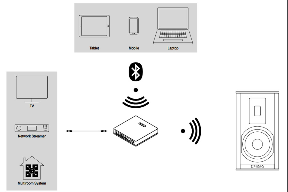 Das PIEGA connect überträgt die Musikdaten per Funk an die Lautsprecher und verfügt über ein Bluetooth aptX Modul für das Musik-Streamen vom Smartphone oder Tablet.