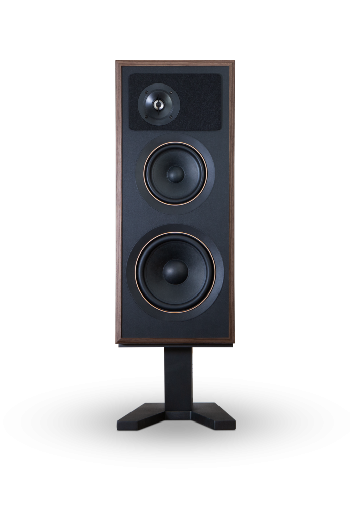 Lautsprecher im Retro-Stil mit offenporigem Walnussfurnier und speziellen Lautsprecherständern.