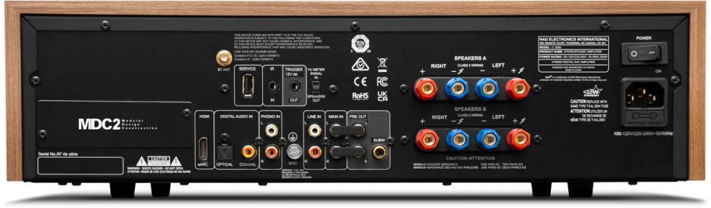 Le design rétro de l'ampli Nad C3050 contraste avec la connectique moderne qui possède un étage numérique complet. Celui-ci met à disposition une entrée optique et une entrée coaxiale pour y relier un lecteur CD, par exemple. Une entrée HDMI eARC est également de mise pour récupérer le son du téléviseur ou vidéoprojecteur. La section analogique de l'ampli Nad C3050 est également très bien fournie, avec une entrée RCA de niveau ligne et une entrée phono. Celle-ci s'associe à son propre filtre subsonique pour assurer une reproduction transparente et précise. Une entrée RCA directe est aussi de mise pour l'utiliser comme amplificateur de puissance avec un pré-ampli hi-fi ou un ampli home-cinéma. En sortie, le Nad C3050 dispose d'une sortie pré-out RCA pour l'associer à un ampli de puissance externe et une sortie subwoofer pour y connecter un caisson de basses. On trouve également une sortie casque en façade pour profiter de la musique sans déranger votre entourage. Celle-ci s'associe à son propre amplificateur dédié afin d'assurer une écoute de très haute qualité.