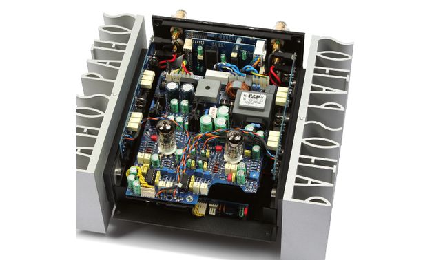 La section pré-amplification de l'amplificateur Pathos Classic Remix s'articule autour d'une paire de doubles triodes - des modèles Electro Harmonix ECC88 / 6922 - utilisées en configuration différentielle. Chacune d'elle est donc chargée d'un seul canal afin d'assurer un traitement symétrique du signal, sur l'entrée symétrique (XLR) comme sur les entrées asymétriques (RCA). Les amplis OP se chargent alors d'abaisser l'impédance du signal avant qu'il ne soit pris en charge par les deux contrôleurs de volume Burr Brown PGA2310 (un par canal). L'étage de sortie fait appel à 4 amplificateurs (2 bridgés par canal), une configuration qui préserve la symétrie du signal, limite le risque de dispersion de puissance et améliore l'efficacité énergétique tout en diminuant le niveau de bruit et la production de chaleur. On notera la présence d'une alimentation largement dimensionnée (240 VA) chargée de fournir une grosse quantité de courant parfaitement stabilisé et le soin apporté au sélecteur de source doté de relais spécifiquement élaborés sous vide d'air afin que les contacts ne s'oxydent pas.