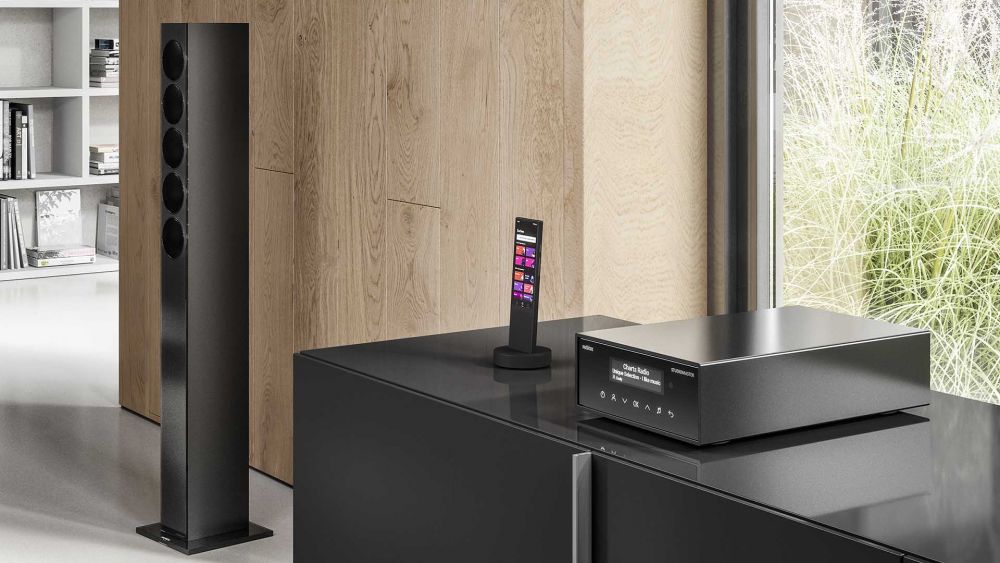Système audio haut de gamme avec amplificateur intégré puissant, DAB+, tuner FM, écran OLED en verre à l'avant et une multitude de sources audio possibles.