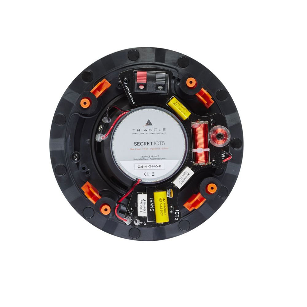 L'enceinte Triangle SECRET-ICT5 est une enceinte circulaire équipée d’un haut-parleur de 130mm et d’un tweeter orientable à dôme de soie de 20mm pour un diamètre total de 216mm. L’enceinte couvre un large spectre de fréquence allant de 60Hz à 20kHz pour une tenue en puissance de 110W.