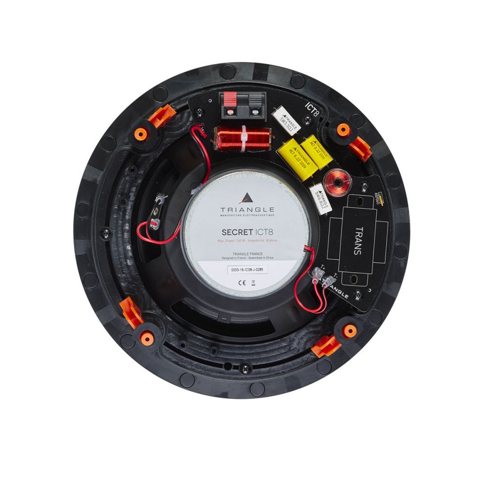 L'enceinte Triangle SECRET-ICT8 est une enceinte circulaire équipée d’un haut-parleur de 200mm et d’un tweeter orientable à dôme de soie de 25mm pour un diamètre total de 284mm. Cette configuration coaxiale permet une excellente homogénéité du son sur une large bande (50Hz à 20kHz) et une tenue en puissance de 160W.